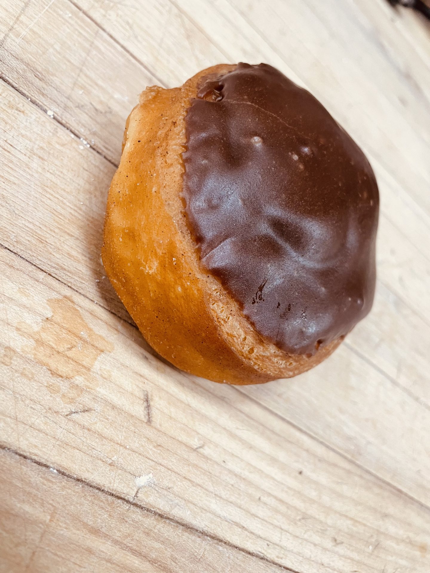 Vanilla Custard (Bavarian cream) filled donut iced with chocolate