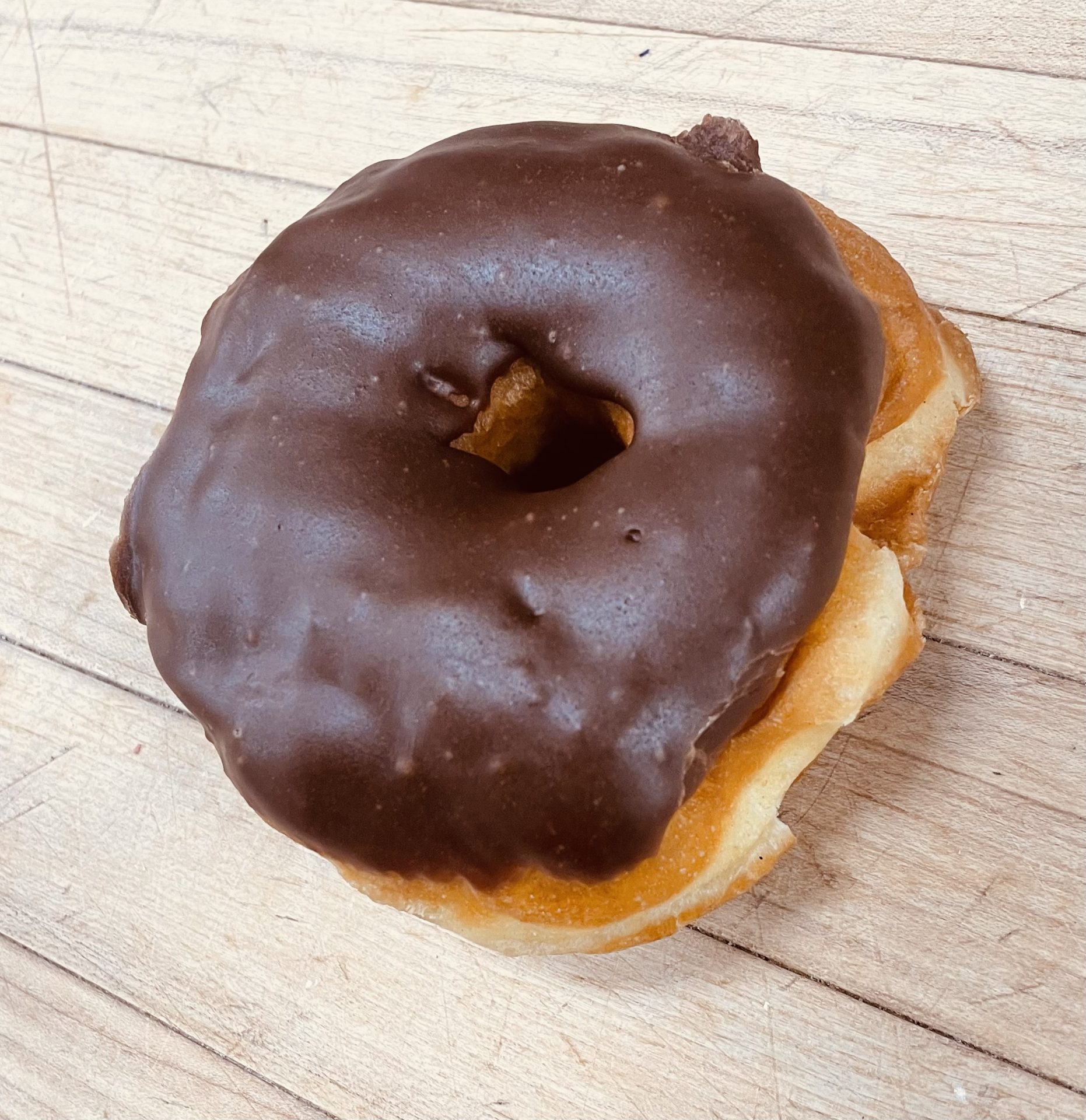 Ring shaped yeast donut topped with chocolate icing