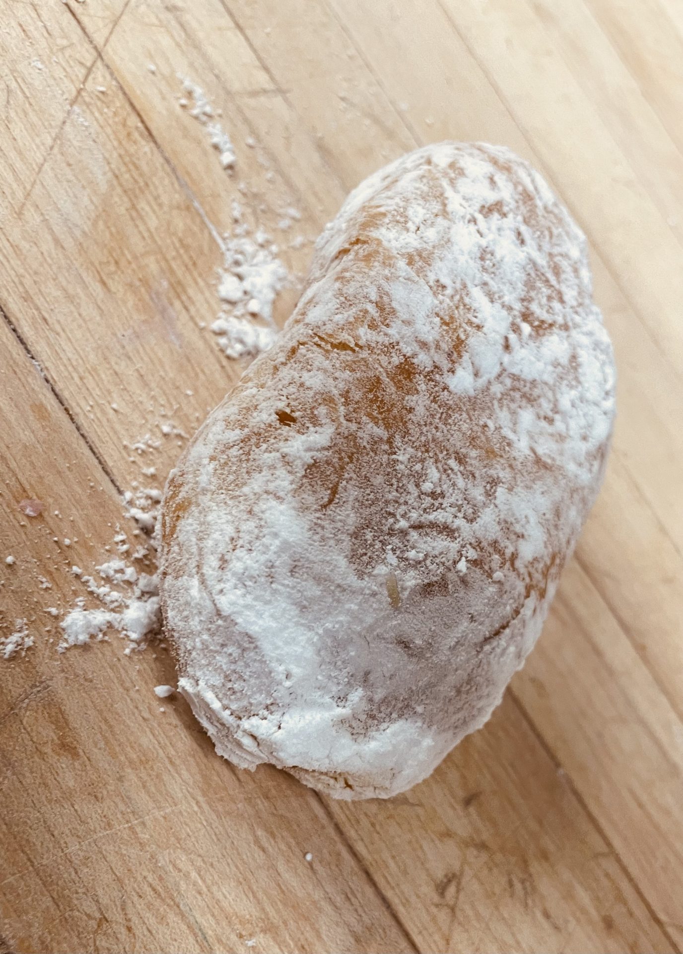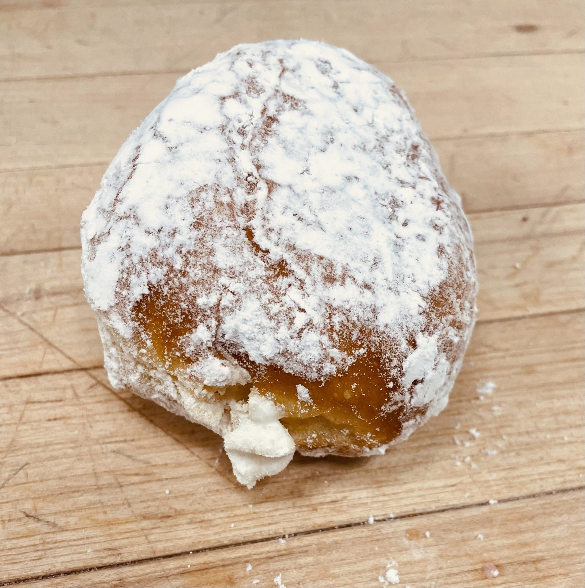 White holland cream filled donut coated with a powdered sugar