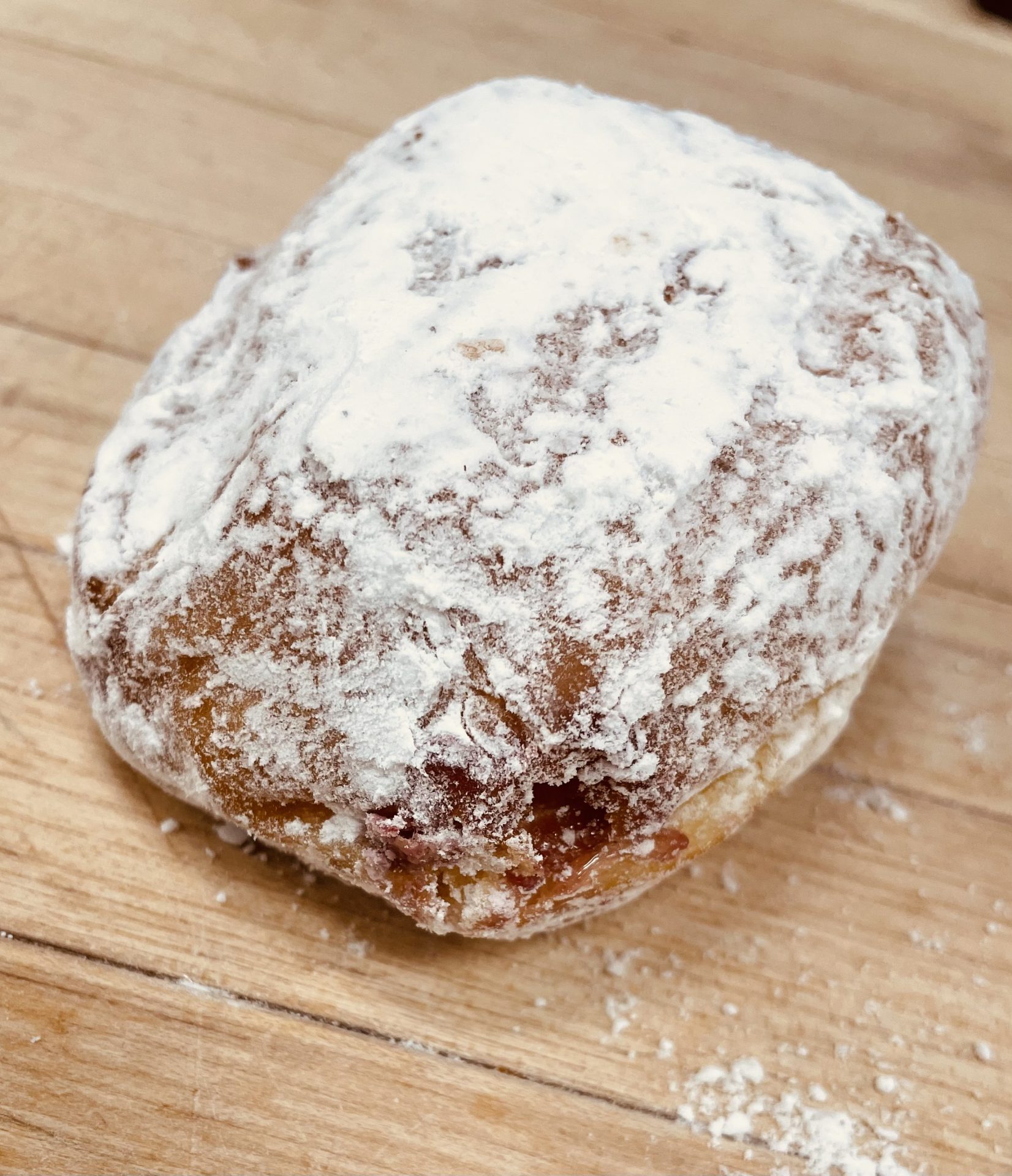 Raspeberry Jelly filled donut coated with powdered sugar